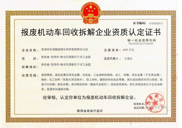根据《报废机动车回收管理办法(国务院第715号令)》《报废机动车回收管理办法实施细则(商务部令2020年第2号)》《报废机动车回收拆解企业技术规范(GB22128--2019)》等有关规定,宝鸡市丰茂物资再生利用有限责任公司严格按照有关规定要求,高起点、高标准建设报废机动车回收拆解项目,顺利通过了网上审核、全网公示、专家现场核验等 ...